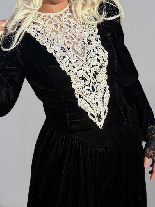 Vintage Jessica McClintock Black Velvet Embroidered Maxi Dress Prom Wedding Gown