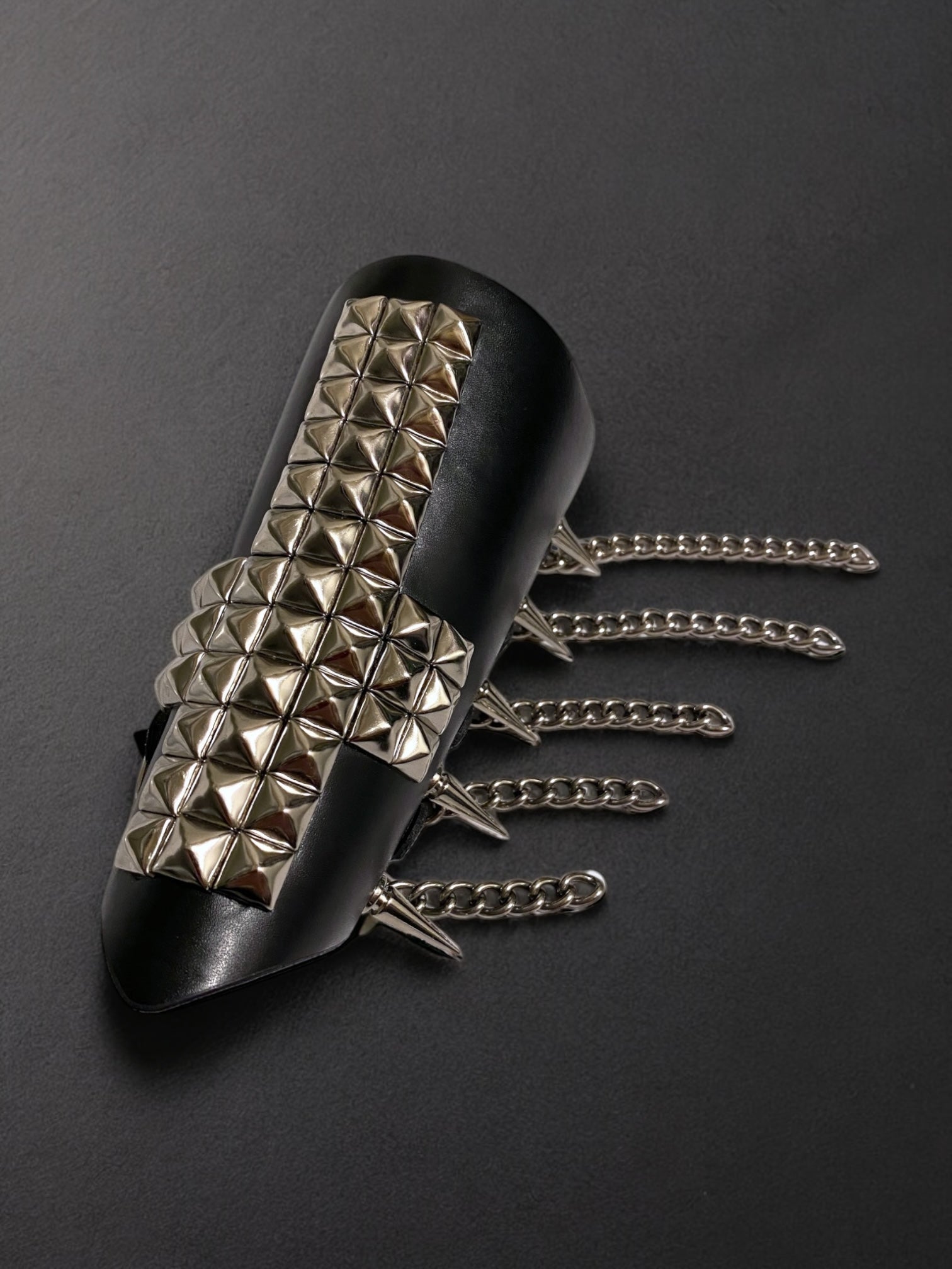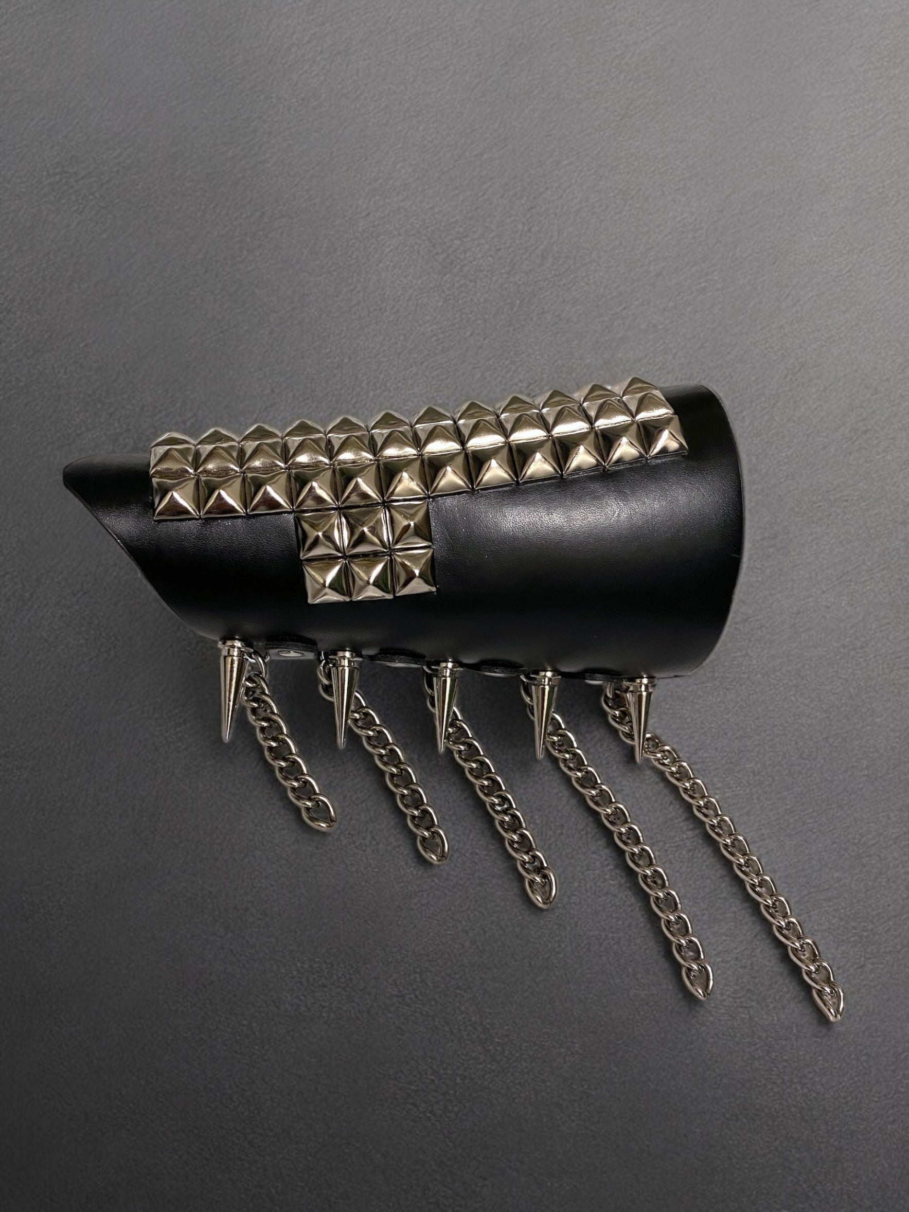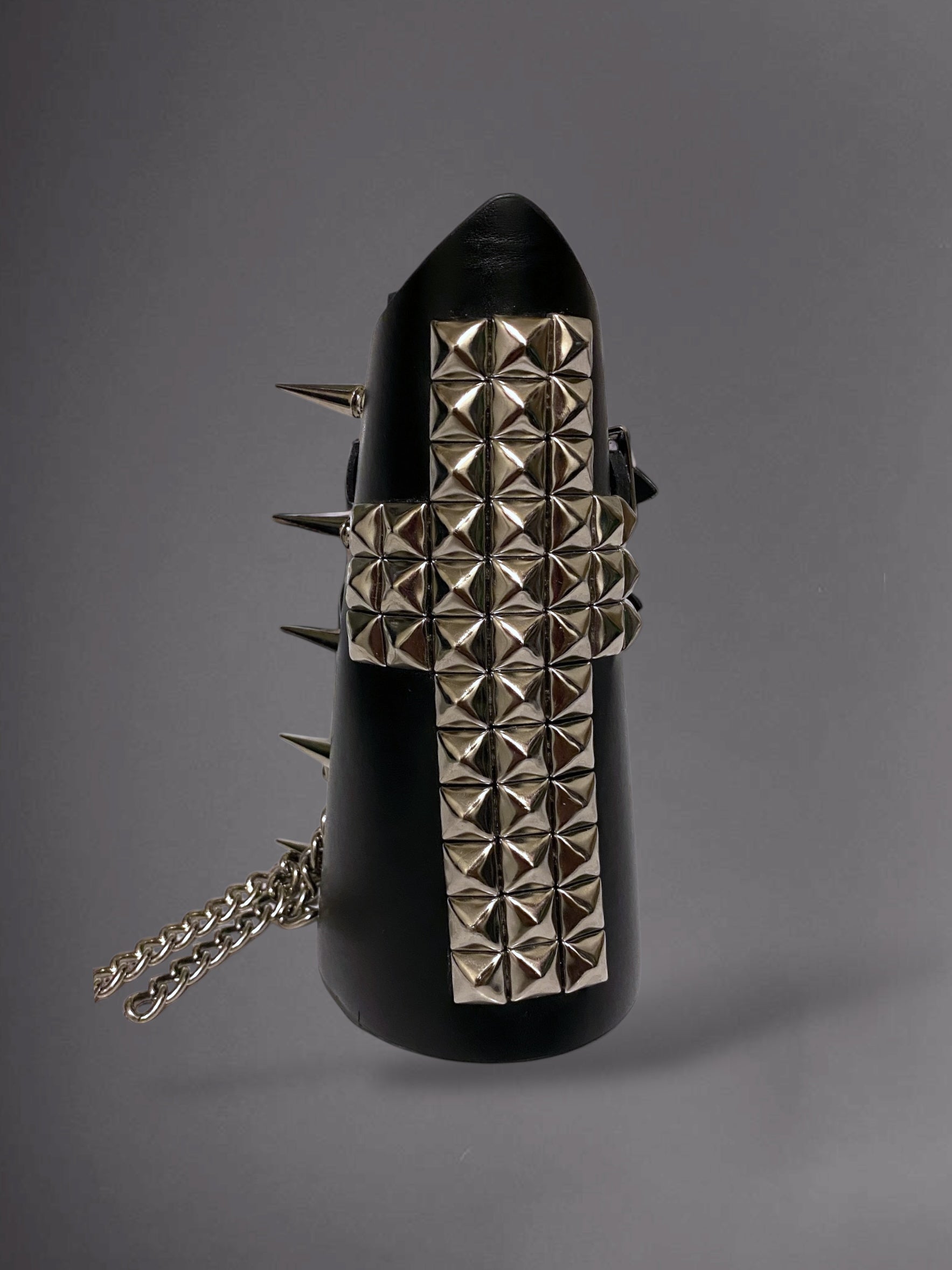 Custom one of a kind. Vegan faux leather construction. Silver tone heavy duty hardware (studs, spikes, chains, buckles). Adjustable buckle closure. Goth, metal, biker, death metal, avant garde, and brutalist style.