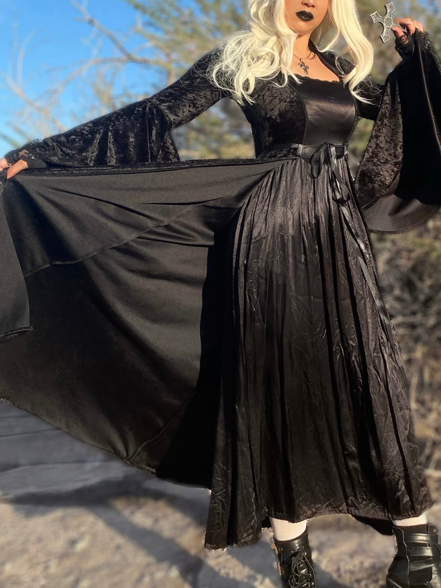 Perfect goth vampiric gown from the OG Lip Service. Rich black velvet, elegant lace edges, black satin panel down front and micro braided rope border embellishments along collar and bust. Has a satin ribbon that ties under the bust. Velvet with lace-lined extra flared bell sleeves. Made in the US. Vintage