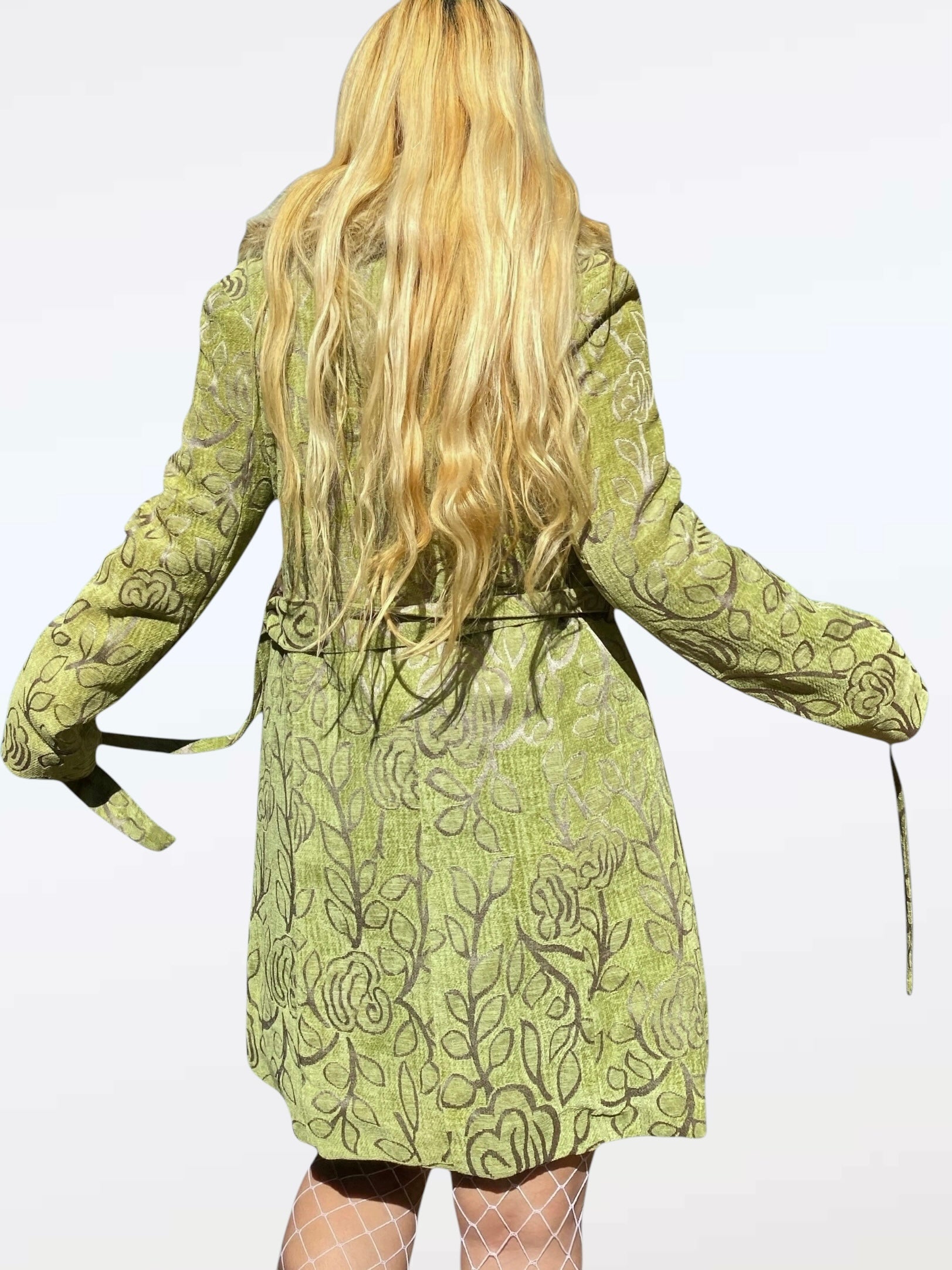 Elegant and completely gorgeous light olive green floral crushed velvet and black semi sheer scrunch fabric. Vintage from the 90s, by: Chicos. Size 2. Great condition. Oversized fit! Rayon & Poly blend. No front closure meant to drape open 🔱