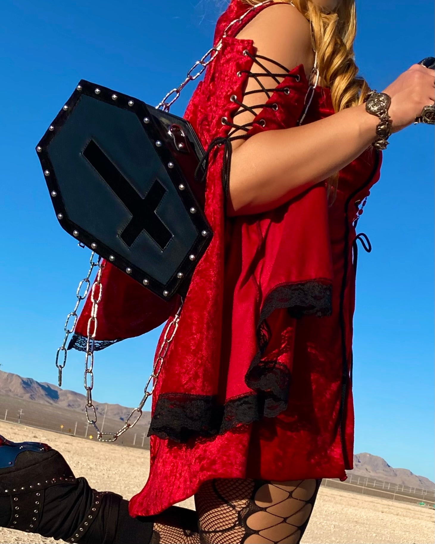Lip Service, vintage from the 90s. Exquisite red crushed velvet construction. Extra flared open cut bell flared sleeves w/ black detailed lace trim. Laces up in front down to waist then flows open. Thick black cord filigree vertical embellishments down front. Low to high cut. Laces on upper arms. Shoulders are cutout for a unique sultry design