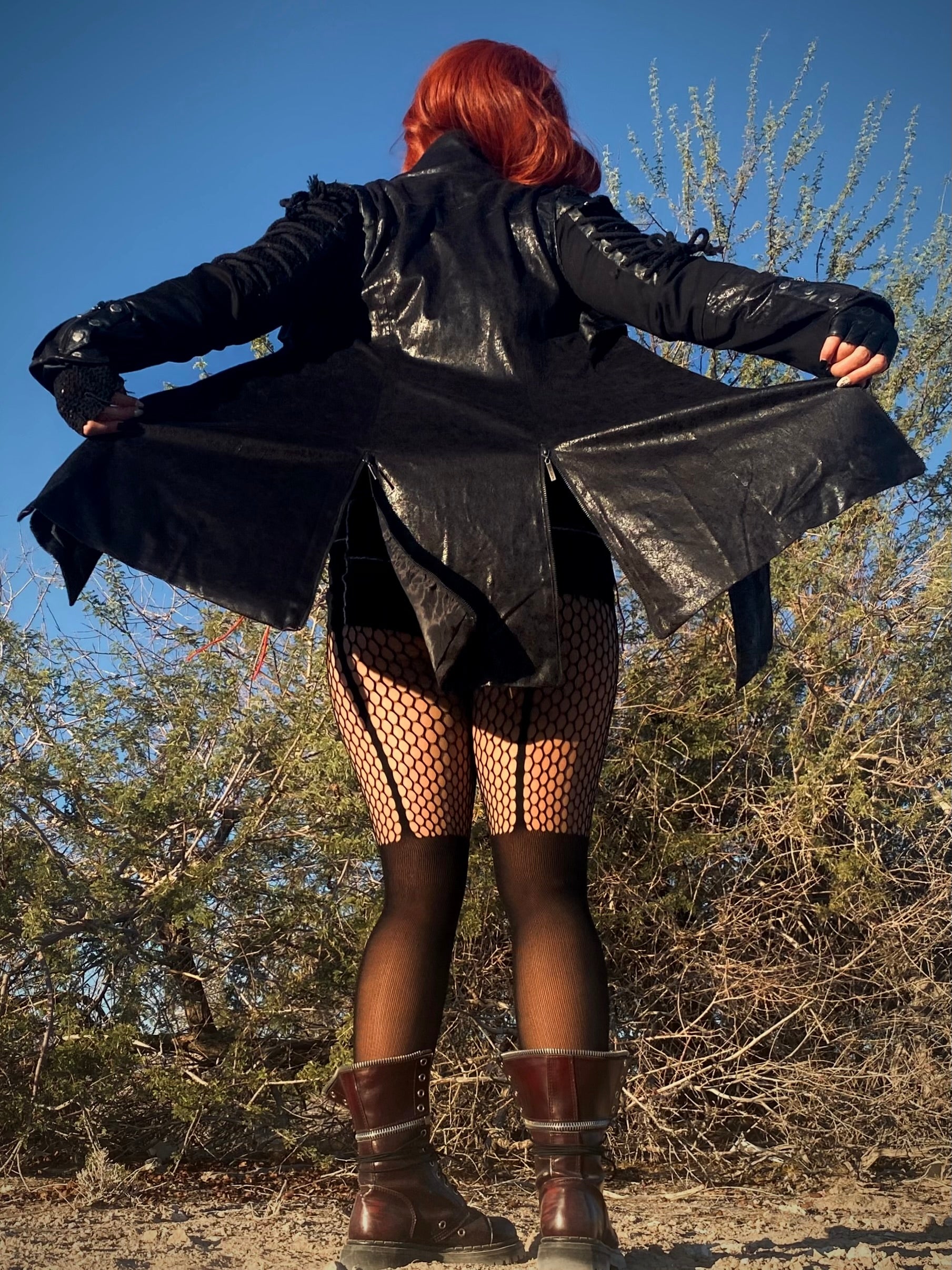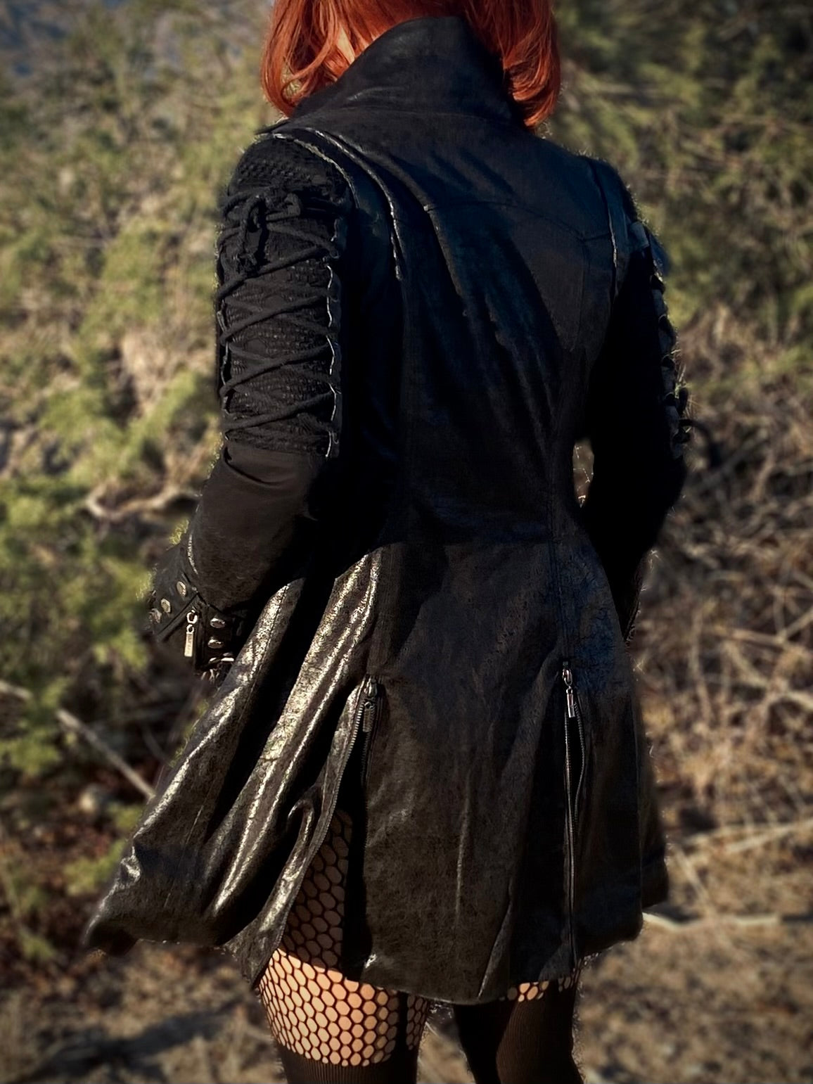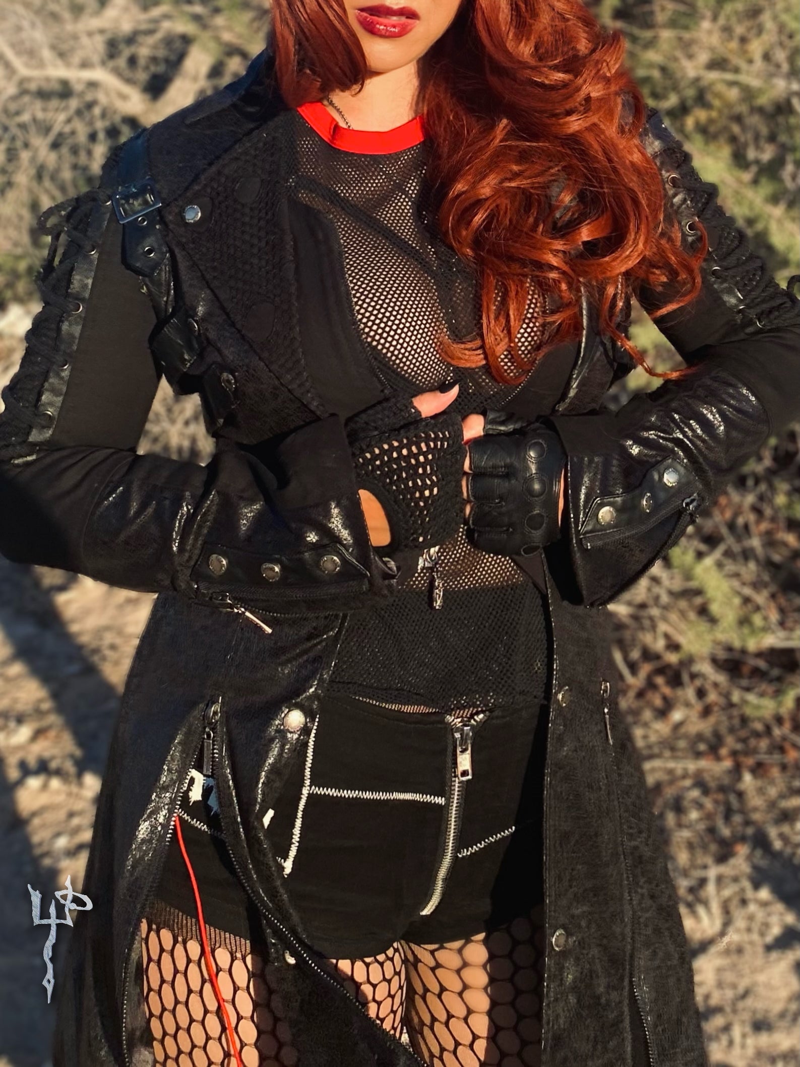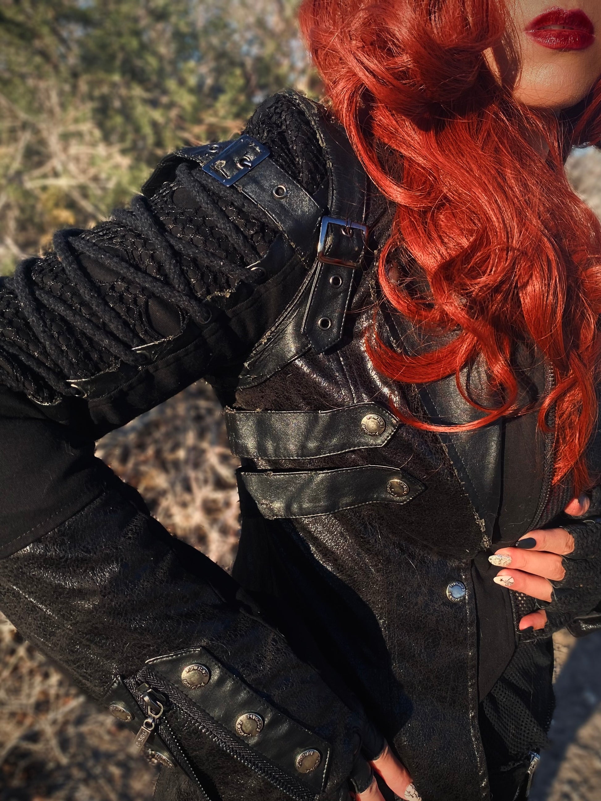 This jacket is so lush. Cyberpunk and goth vamp vibes. High collar (double pointed). Metal buttons and ornate zip pull. Buckle straps. Fishnet details. Zippers on cuffs and bottom section. Distressed. Mid length. Shoulder laces [Adjustable]. Cotton and poly construction