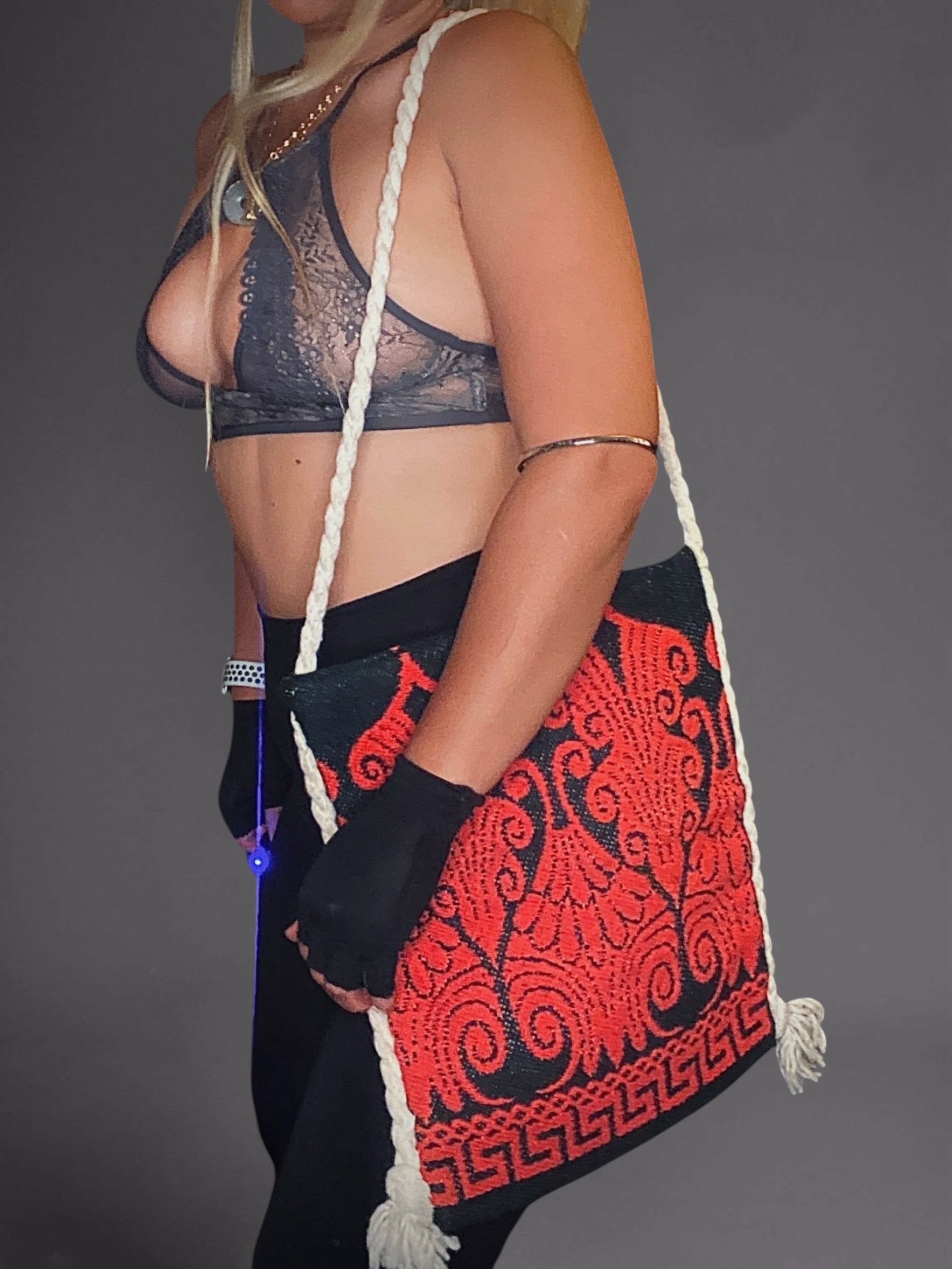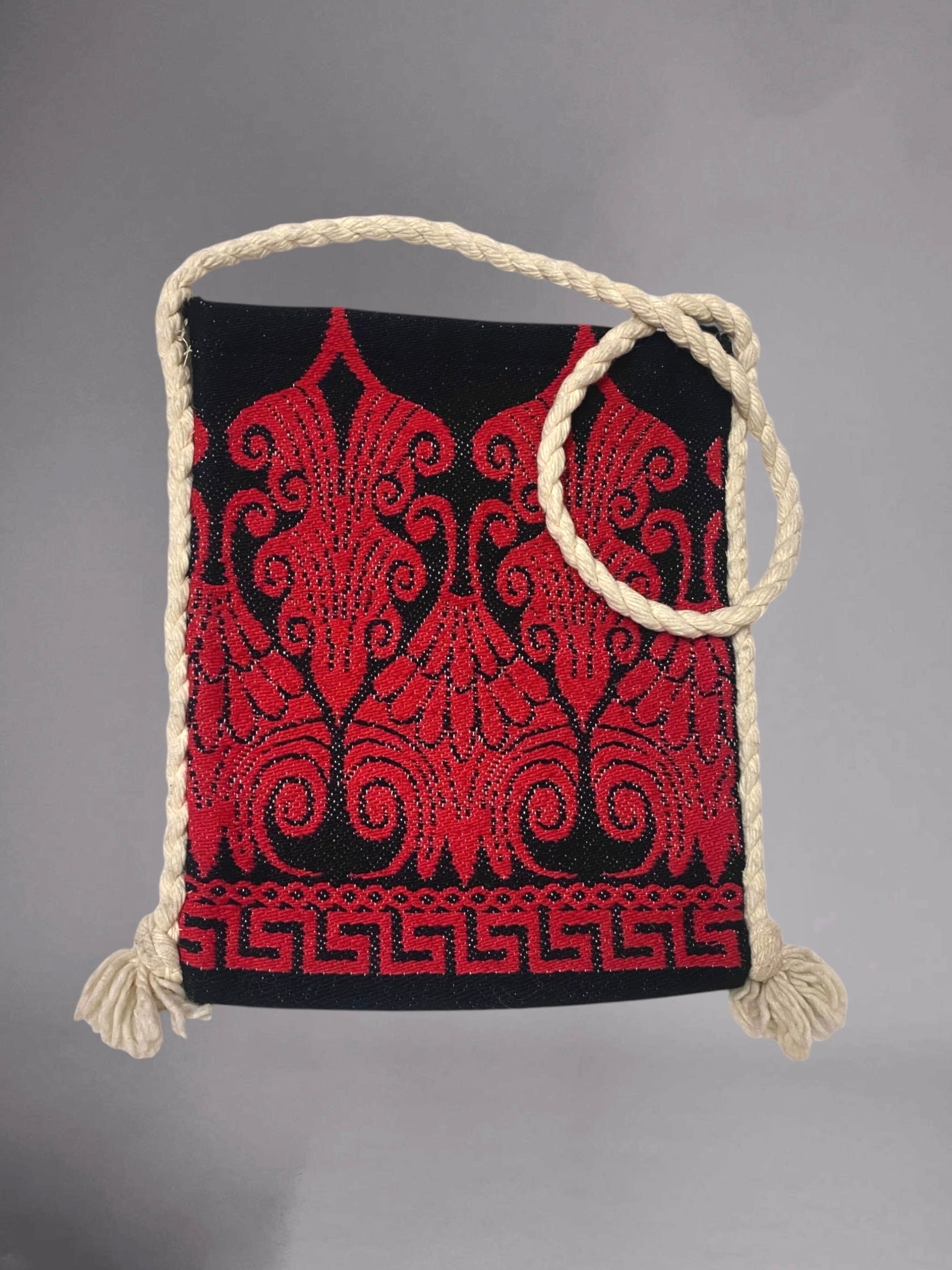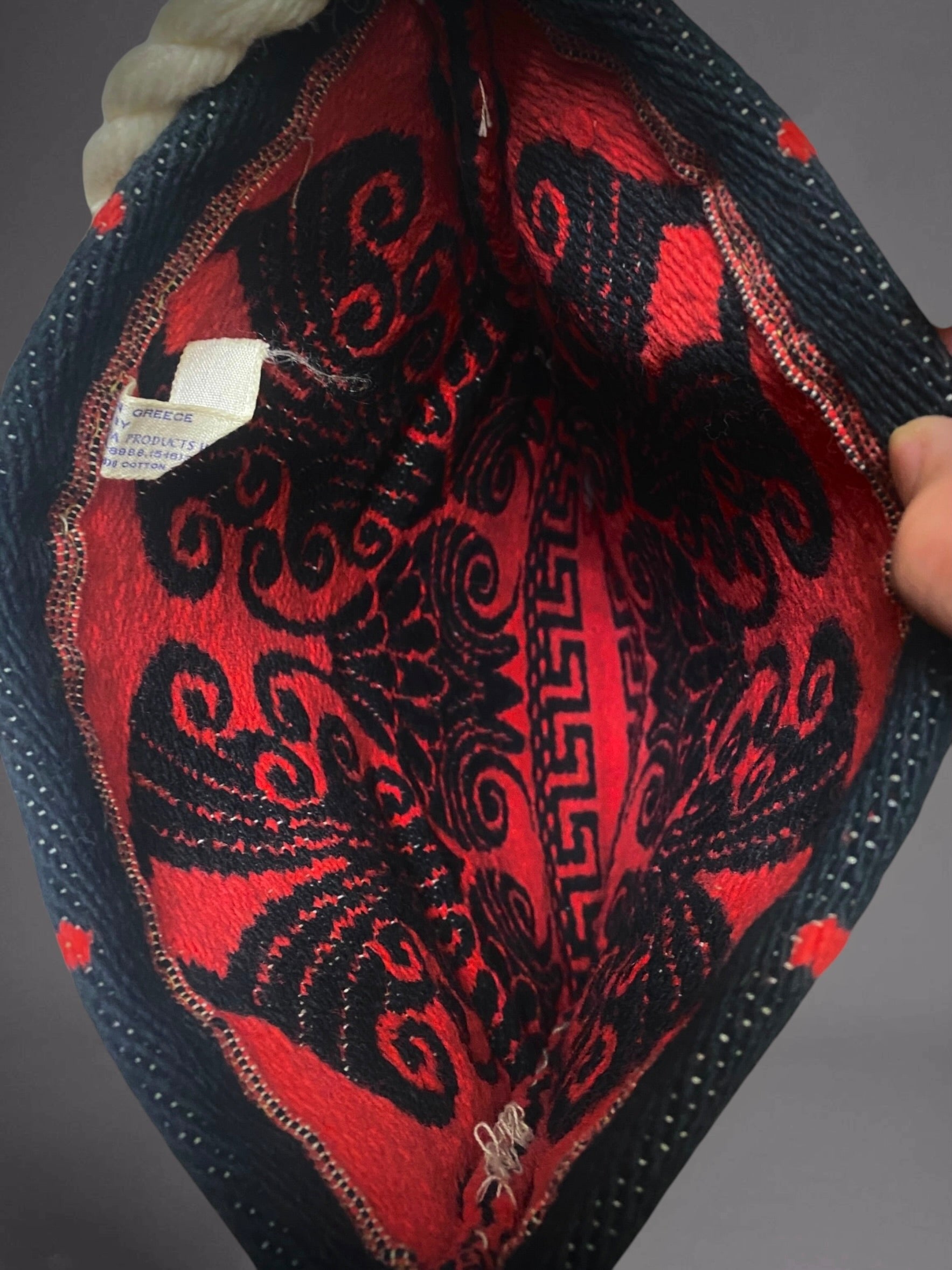 Features a twisted rope strap with tassels at the ends, elegant muted red and black thick tapestry floral design, and semi coarse cotton construction. Vintage piece. Made in Greece. Pair this with a hooded dress and utility belt for an urban desert look. In fair condition