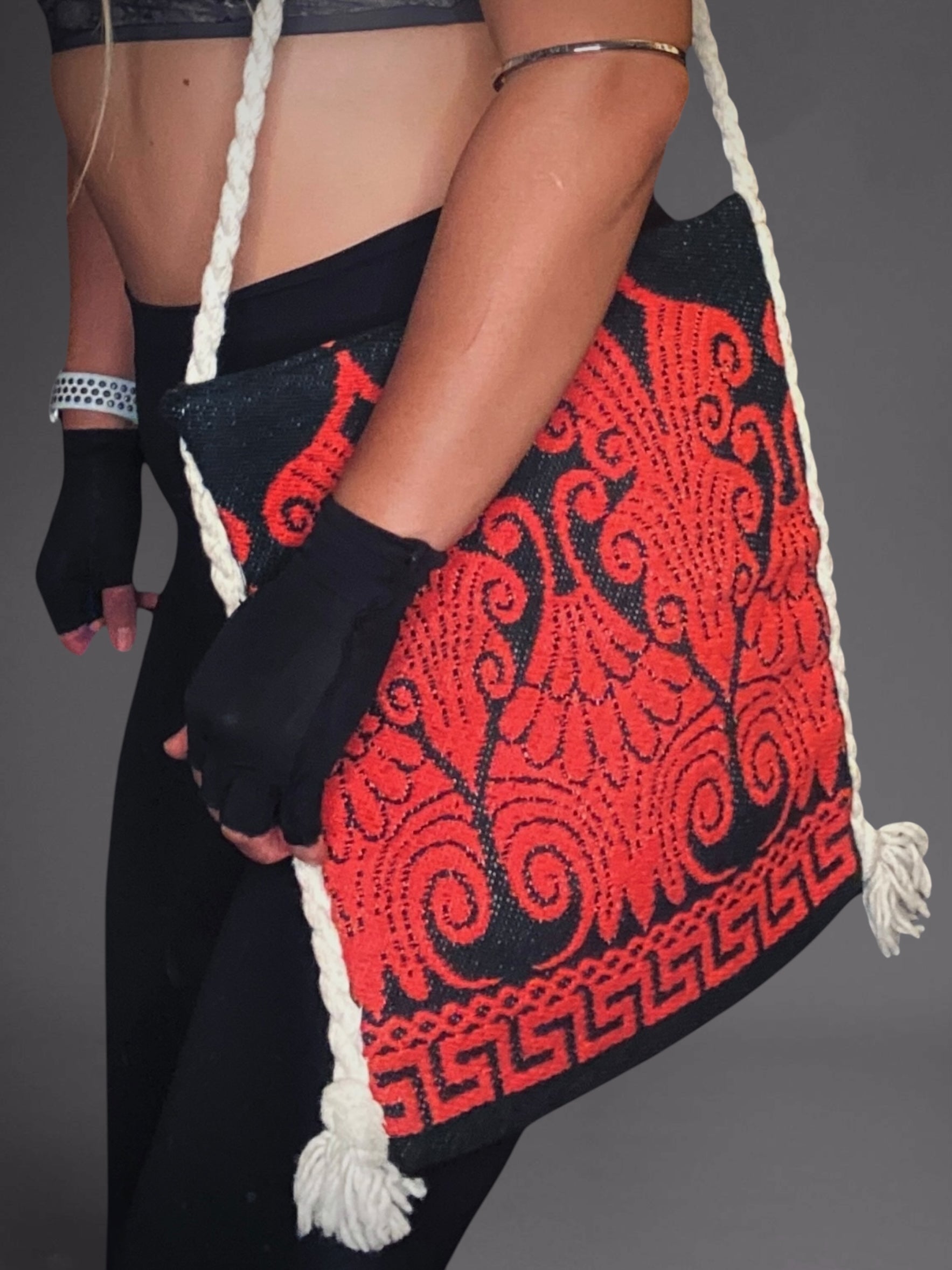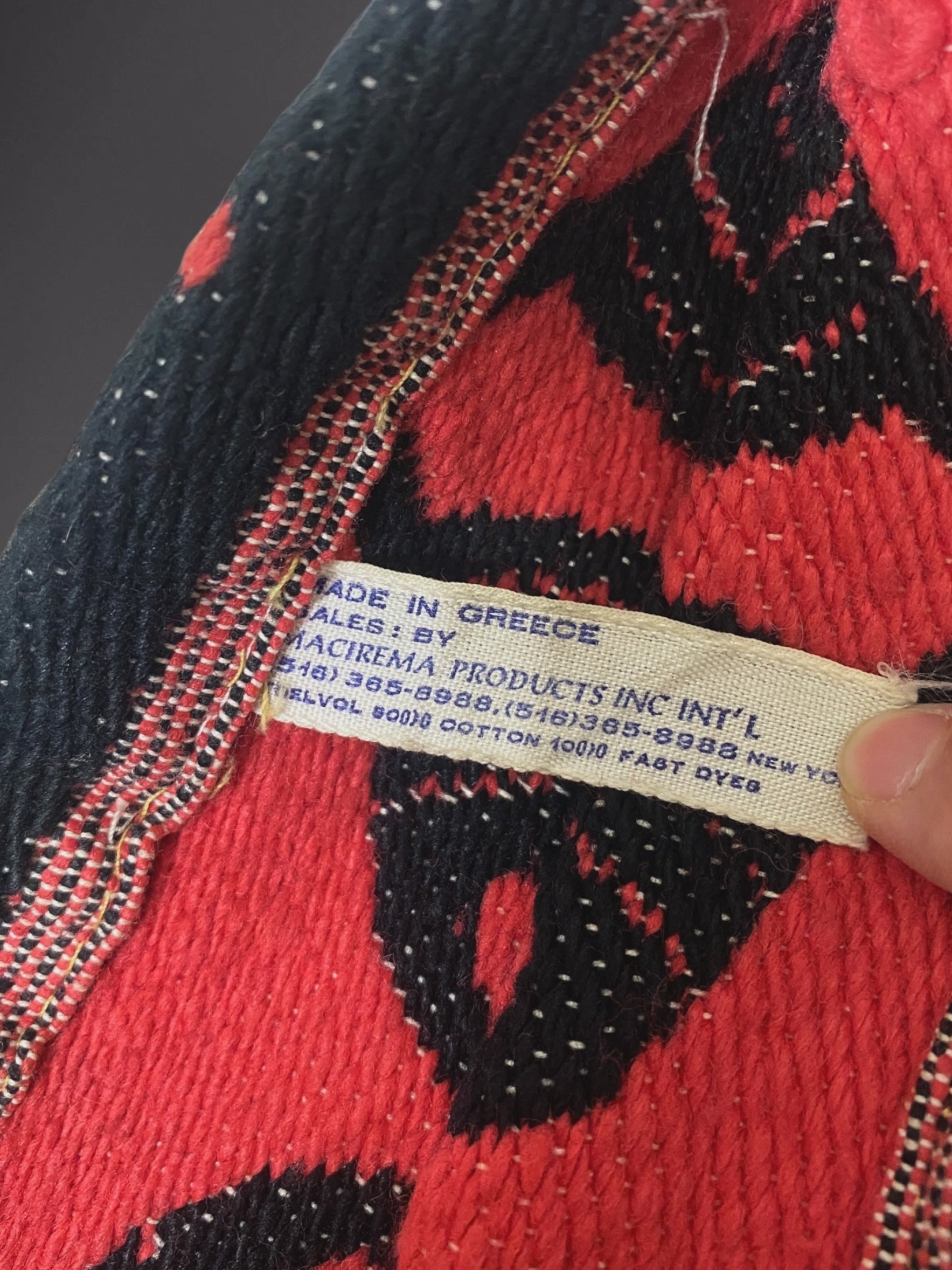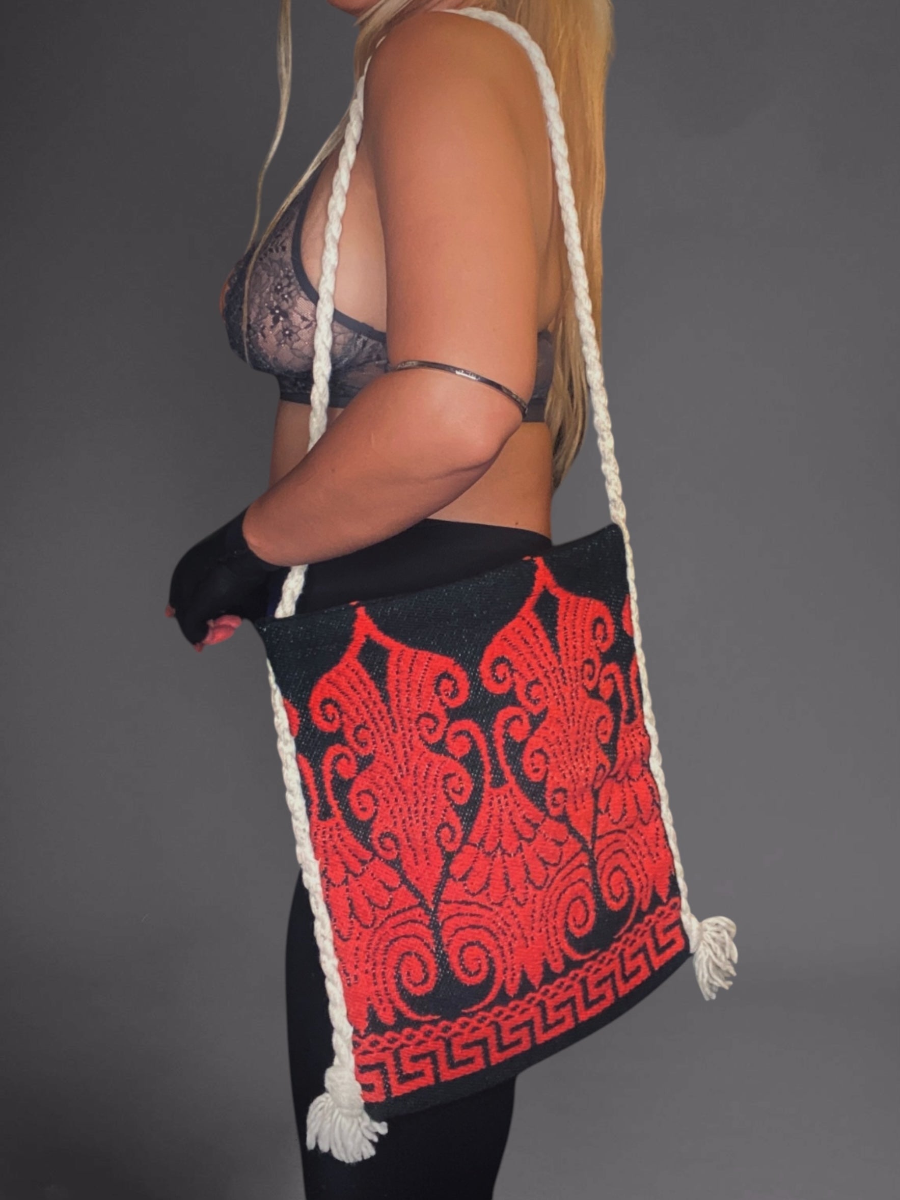 Features a twisted rope strap with tassels at the ends, elegant muted red and black thick tapestry floral design, and semi coarse cotton construction. Vintage piece. Made in Greece. Pair this with a hooded dress and utility belt for an urban desert look. In fair condition