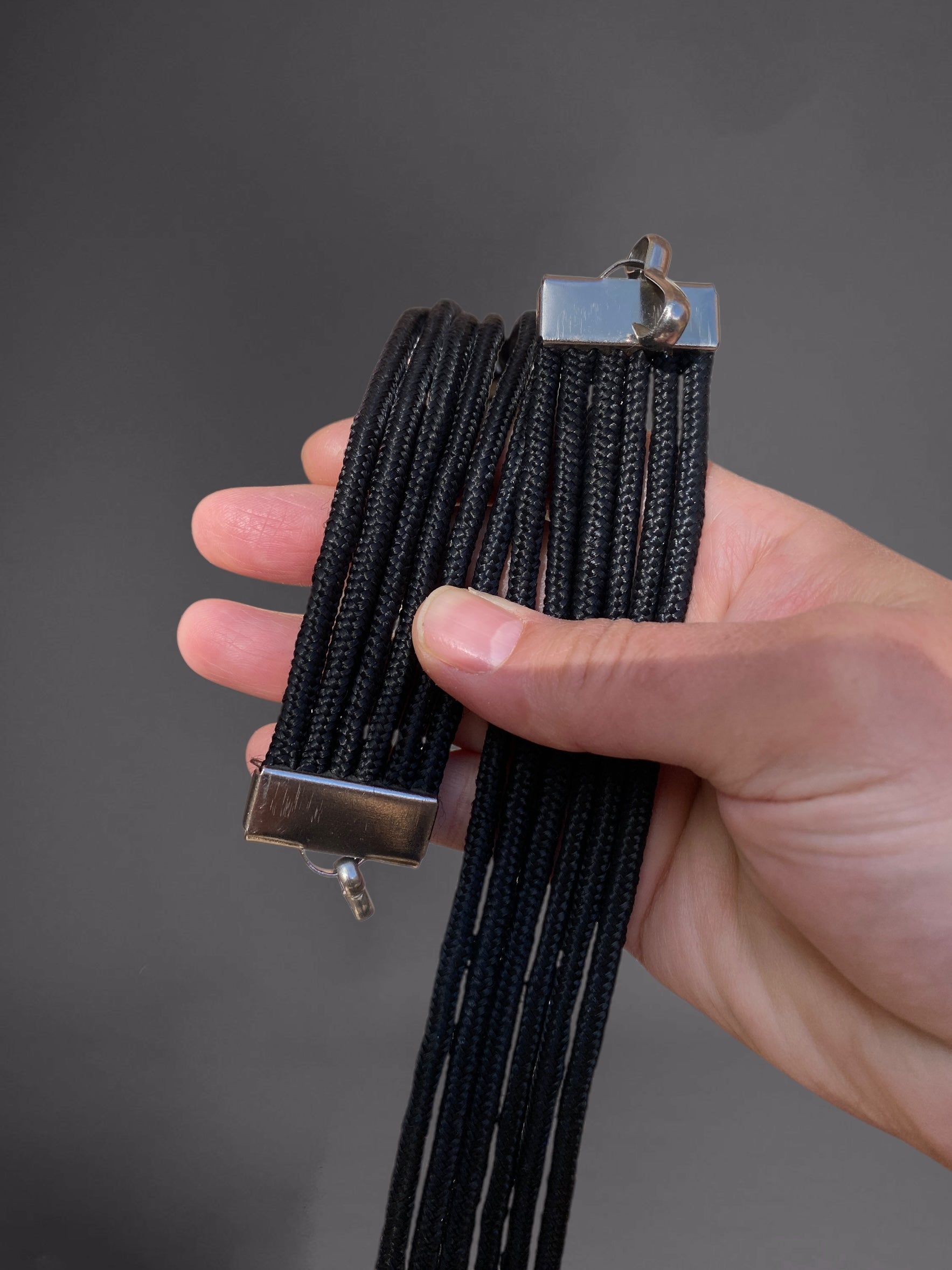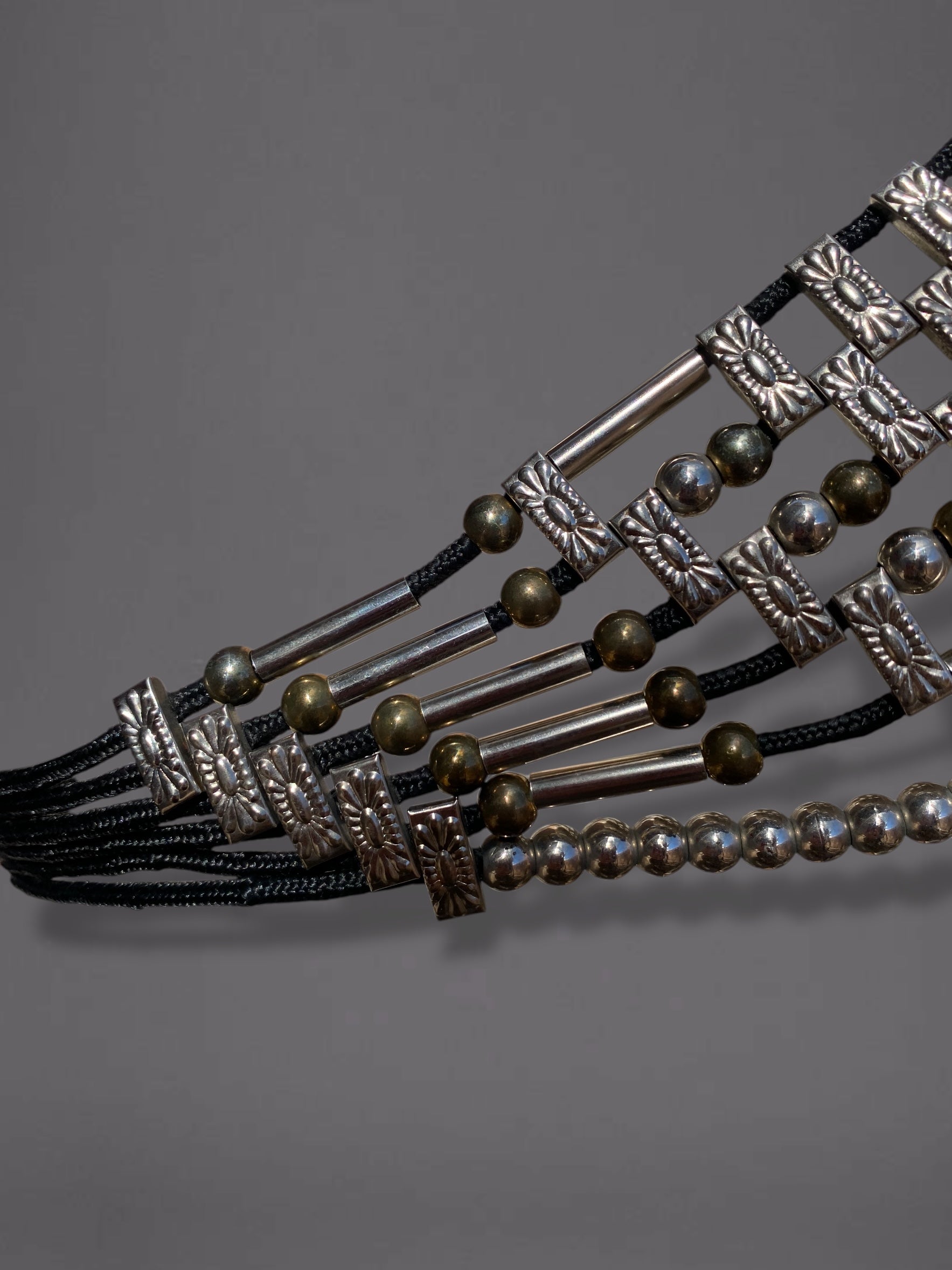 Super cool and intricate true vintage 80s belt. Adorned with silver and brass tone beads and has thick black braided rope cords. Single metal hook closure. Perfect to pair with so many different fits.